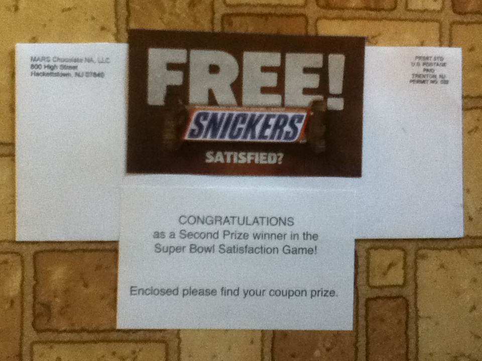 Second Prize Winner in the Super Bowl Satisfaction Game – a coupon for a Free SNICKERS Bar – Thank you MARS Chocolate NA LLC