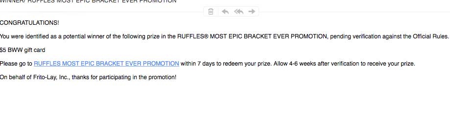You were identified as a potential winner of the following prize in the RUFFLES® MOST EPIC BRACKET EVER PROMOTION, pending verification against the Official Rules.