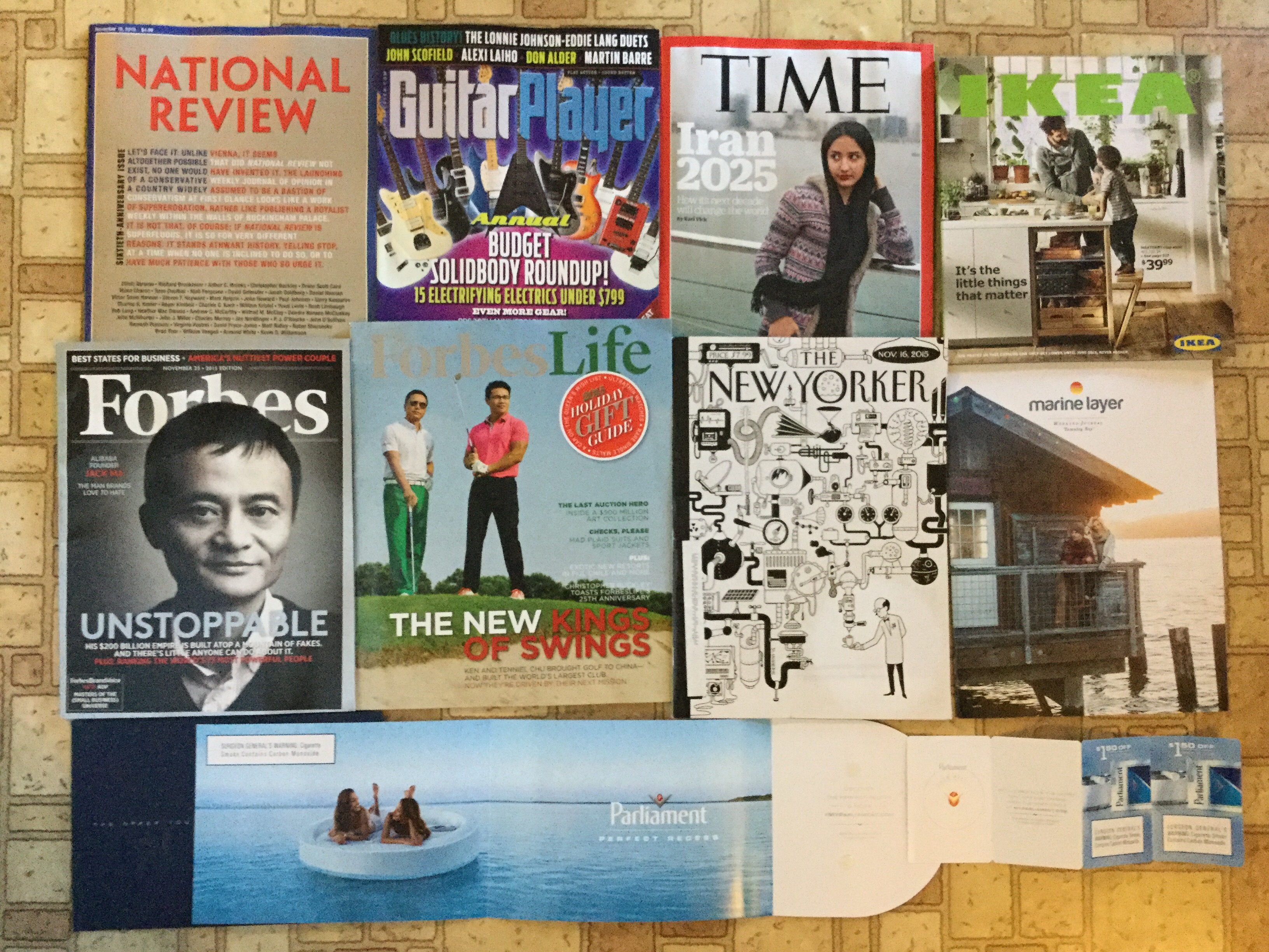 📊 National Review weekly 🎸 Guitar Player Holiday Catalog ⌛️ TIME Weekly 🎯 IKEA Catalog 🌞 Forbes Life Weekly ☔️ The New Yorker weekly ⛵️ Marine Layer catalog 🚬 Parliament coupons 💰