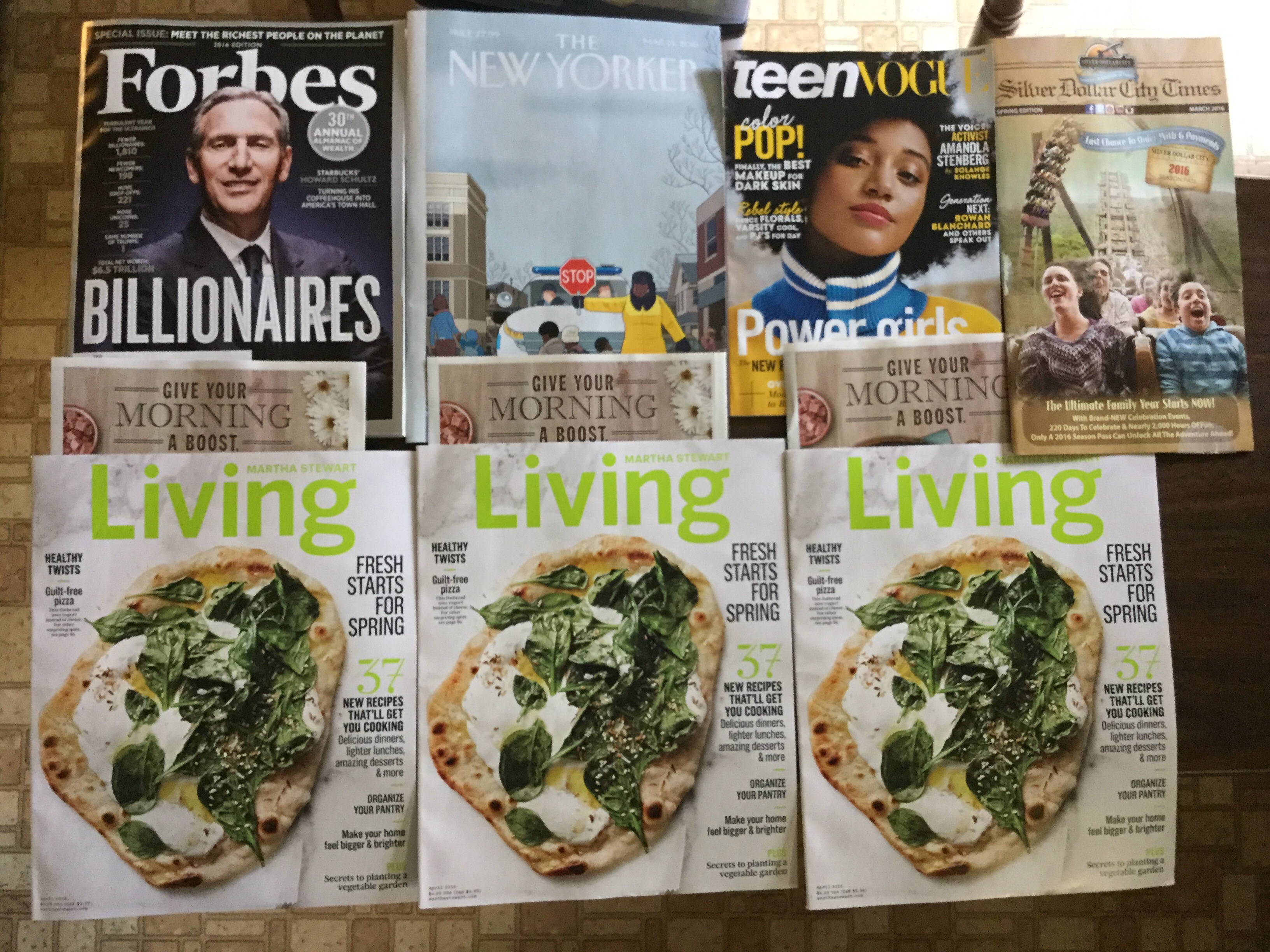 💰 Forbes 👮🏻 The New Yorker 💇🏾 Teen Vogue 🏆 Silver Dollar City Times 🍕 Martha Stewart Living magazines 📚
