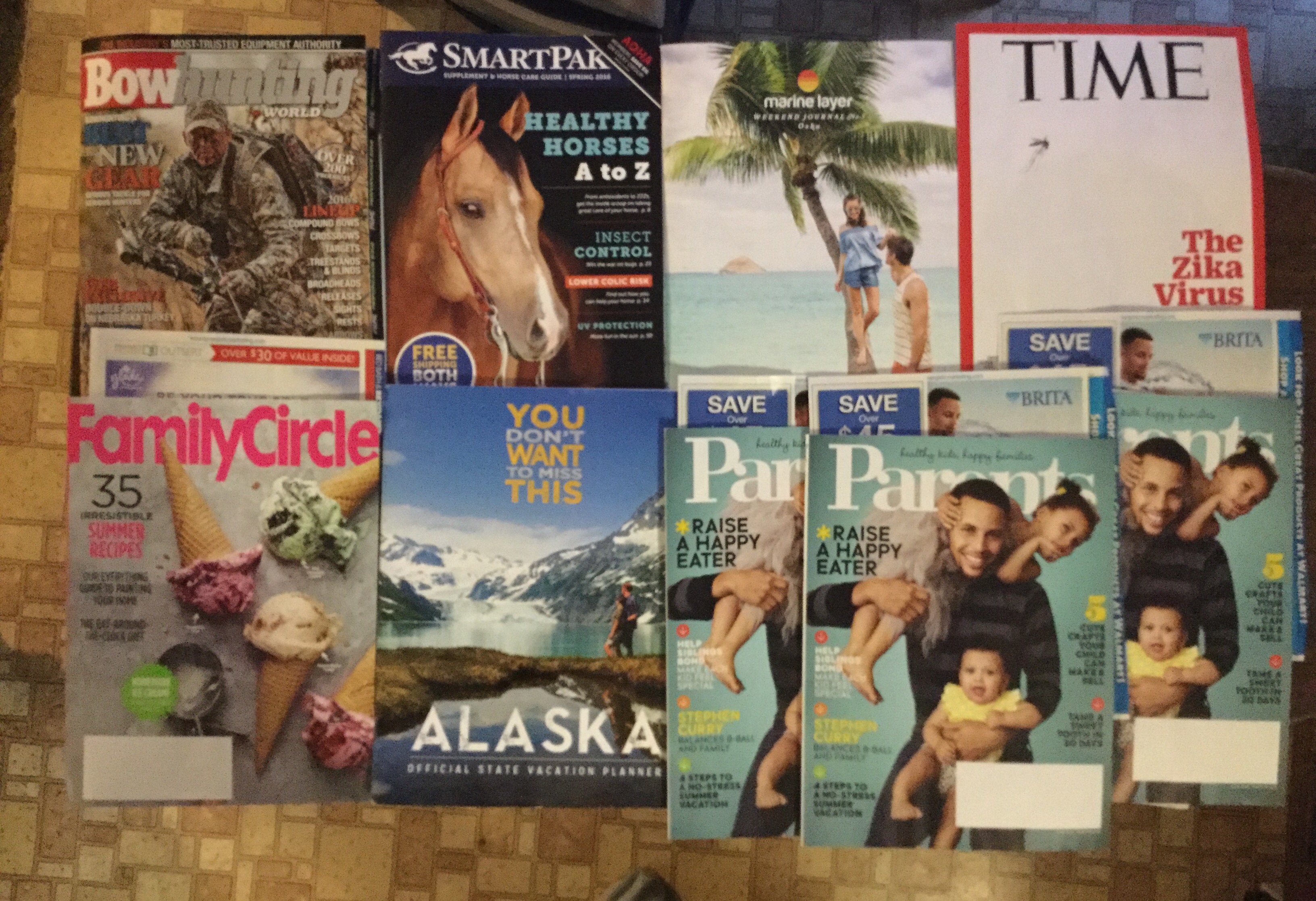 📚 📘today’s magazines🏹 BowHunting🏇SmartPak🐠Marine Layer⏰TIME👩👩👧👧Family Circle⛄️Alaska👩👩👧👦Parents👑