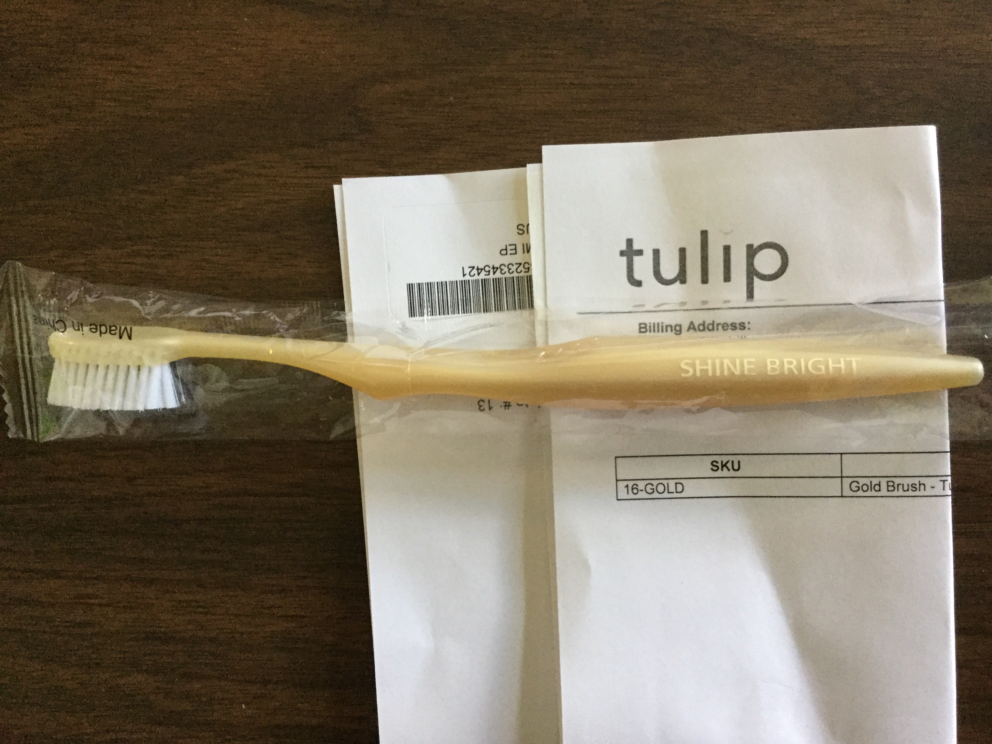 📬 😬 Thank you very much tulip Customer Service Fulfillment Center 🕯 💡 for our Shine Bright 💎 Gold Brush – Tulip Launch Toothbrush 💦 Soft Brush and cleans great ❤️ 🍎