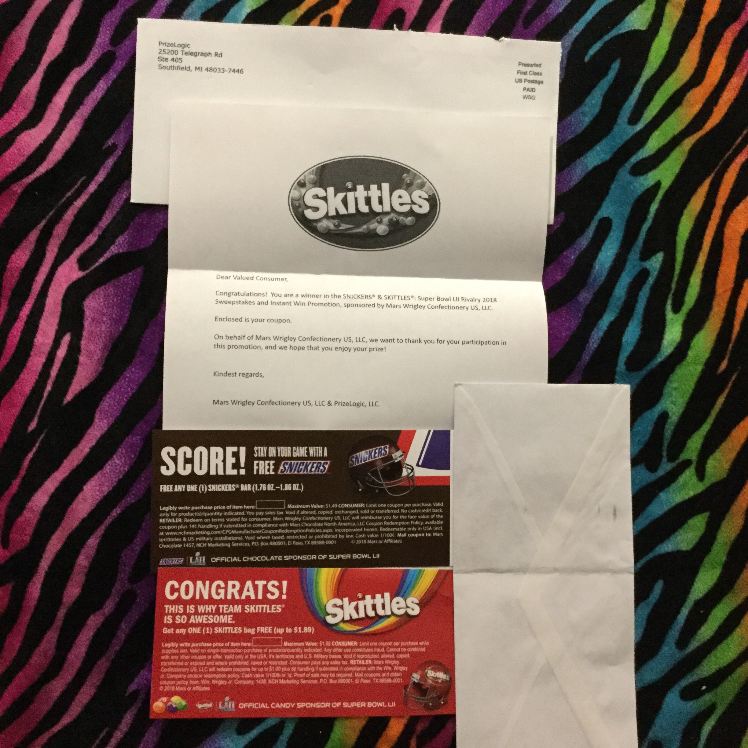 π¬ π Winner in the Snickers & Skittles Super Bowl LII Rivalry 2018 Sweepstakes and Instant Win Promotion. Won candy coupons. Thank you very much Mars Wrigley Confectionery US, LLC. ππ«