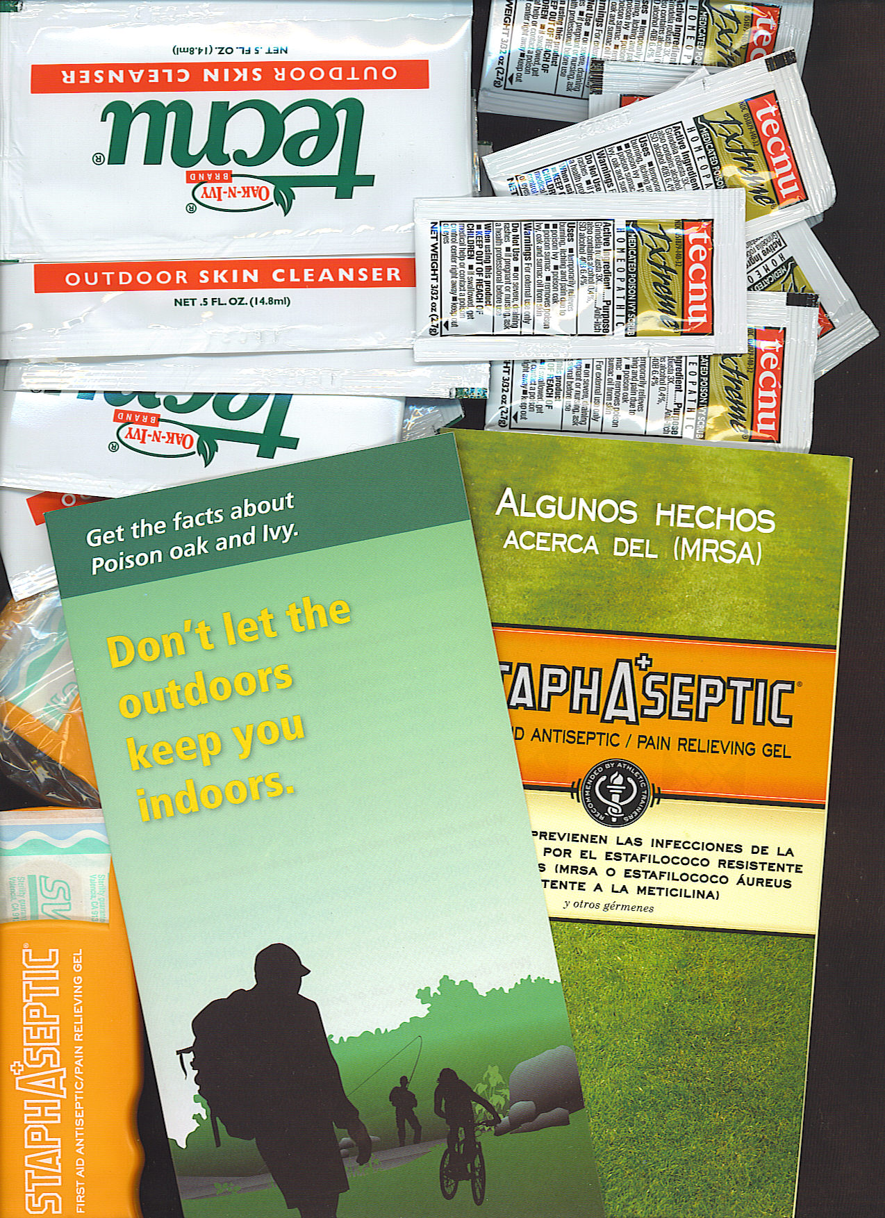 There is about 30 packets of the sample/lots of brochures on poison oak and ivy/band aid holders/skin cleaner(from poison oak and poison ivy)/poison ivy scrub/and two dvd’s one is about MRSA and the other about Poison ivy and poison oak training..
