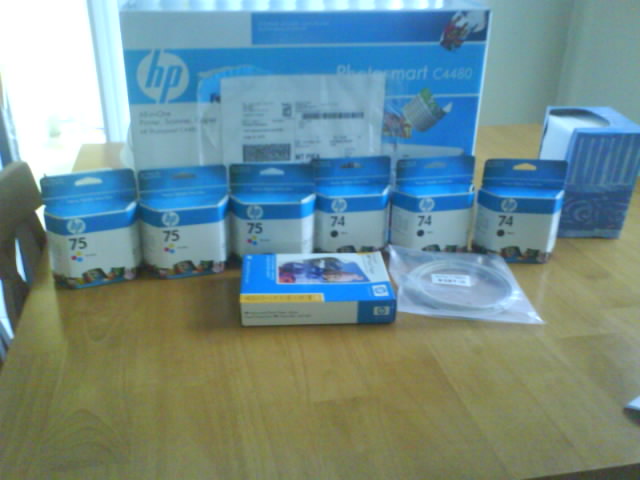HP Photosmart C4480 All-in-one printer, 3 74 HP Vivera Black ink cartridges, 3 75 Tri-color HP Vivera ink cartridges, and 1 100 pack HP Advanced glossy borderless photo paper, 1 printer cable