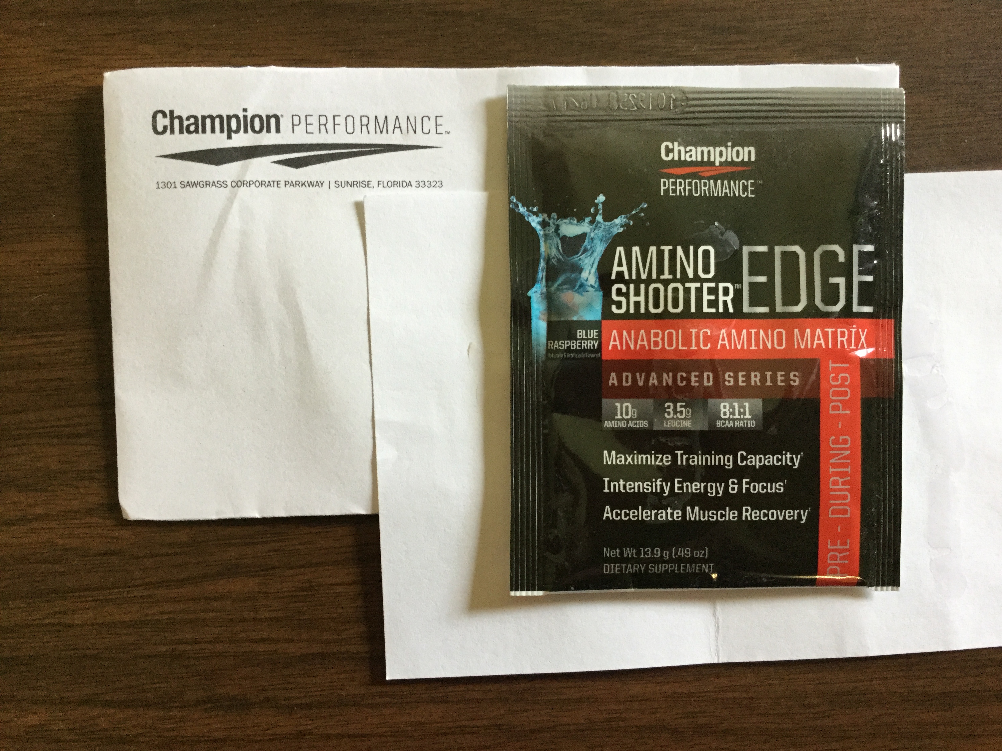 Free Amino Shooter Edge Blue Raspberry Pre-During-Post drink mix from Champion Performance
