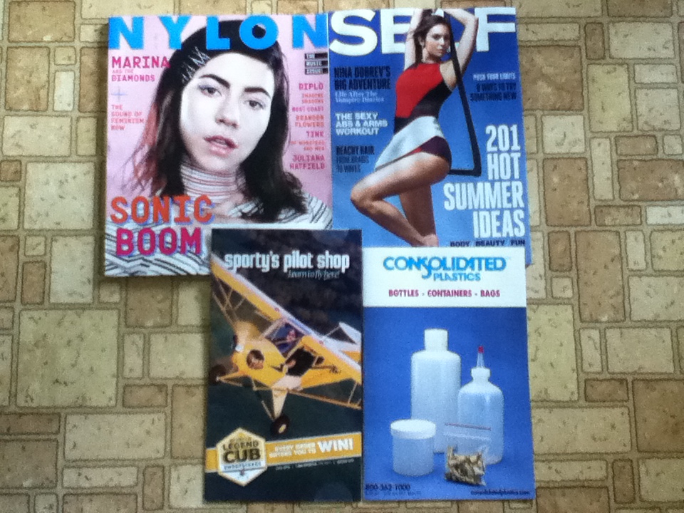 Nylon July magazine – Self June magazine – Sporty’s Pilot Shop Catalog – Consolidated Plastics catalog