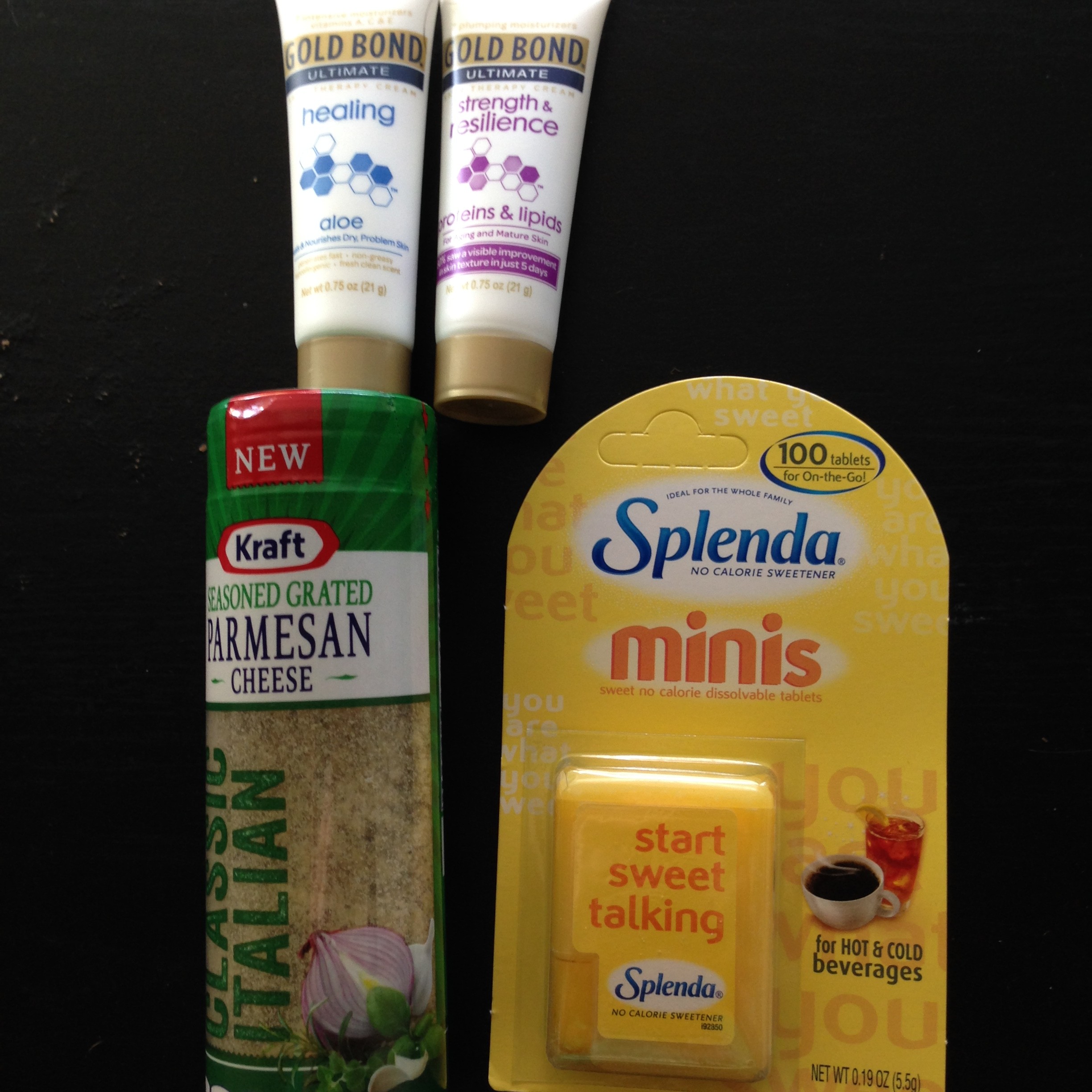 Pinch Me samples: 2 Gold Bond lotions, Kraft parmesan cheese, Splenda minis