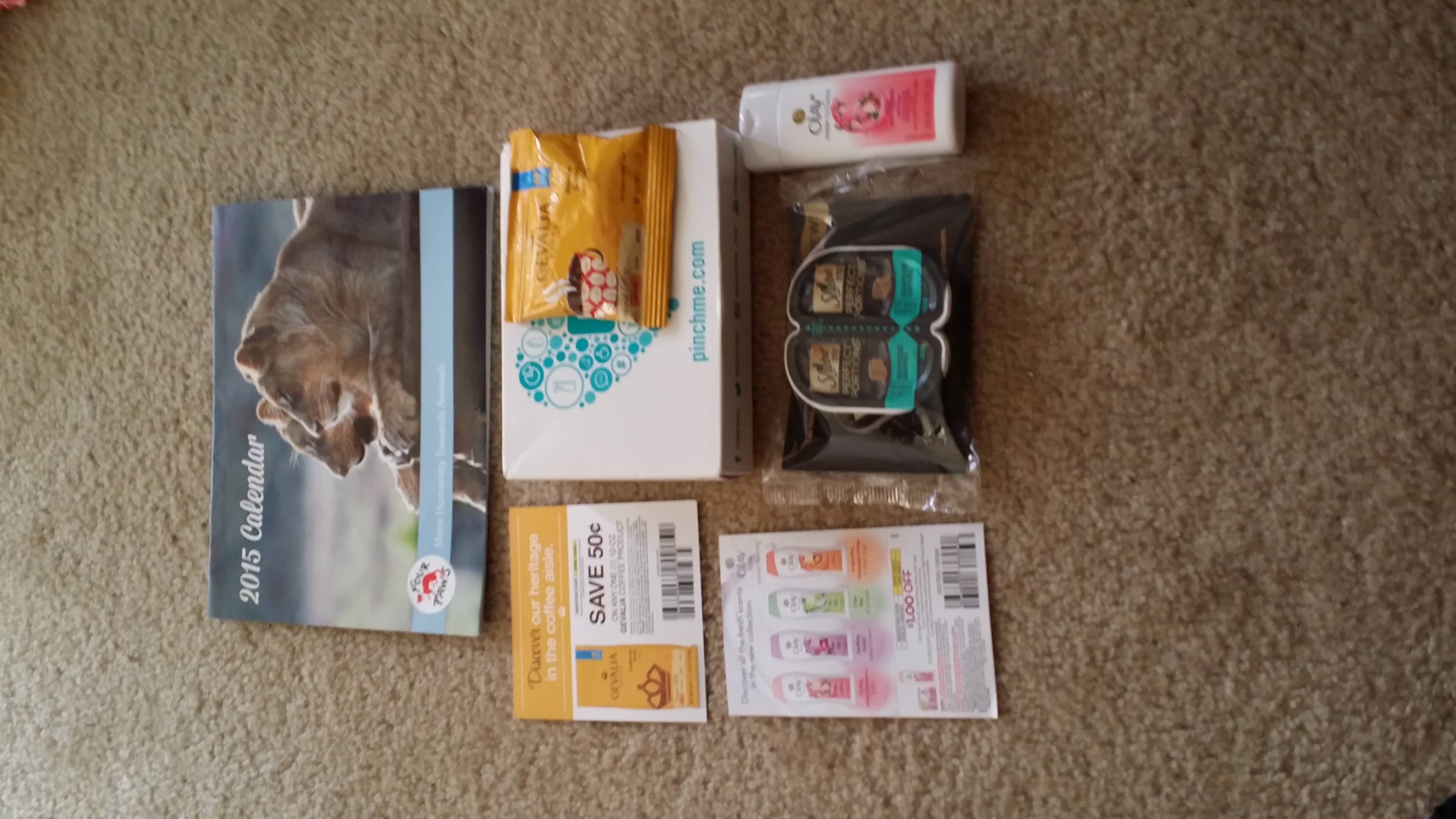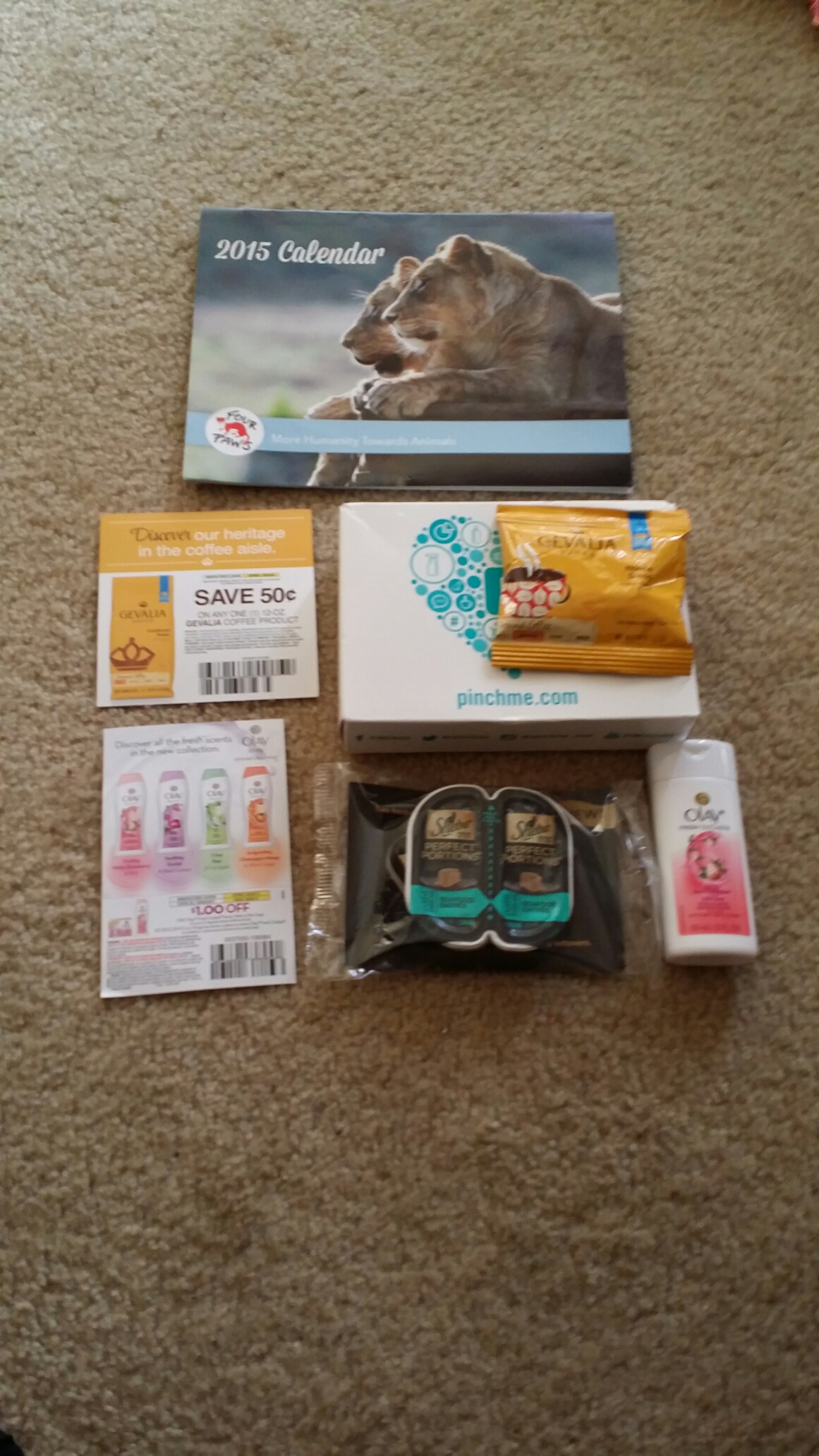Gevalia coffee, olay body wash, sheba cat food samples, coupons from pinchme.com and four paws 2015 calendar